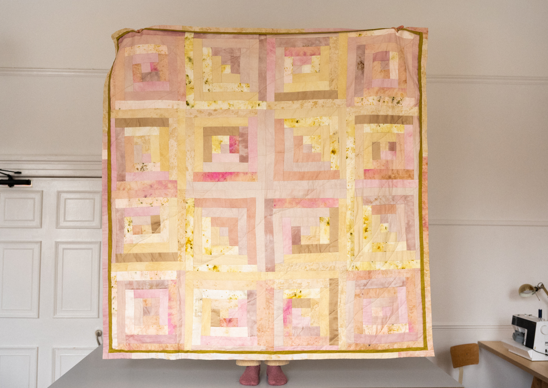 I can confirm: I like to this process, it feels good. The naturally dyed colours make my heart melt, and the log cabin’s repetition is soothing enough that I can slip into a kind of meditation, spiralling strips outward, turning methodically at right angles, over and over again.