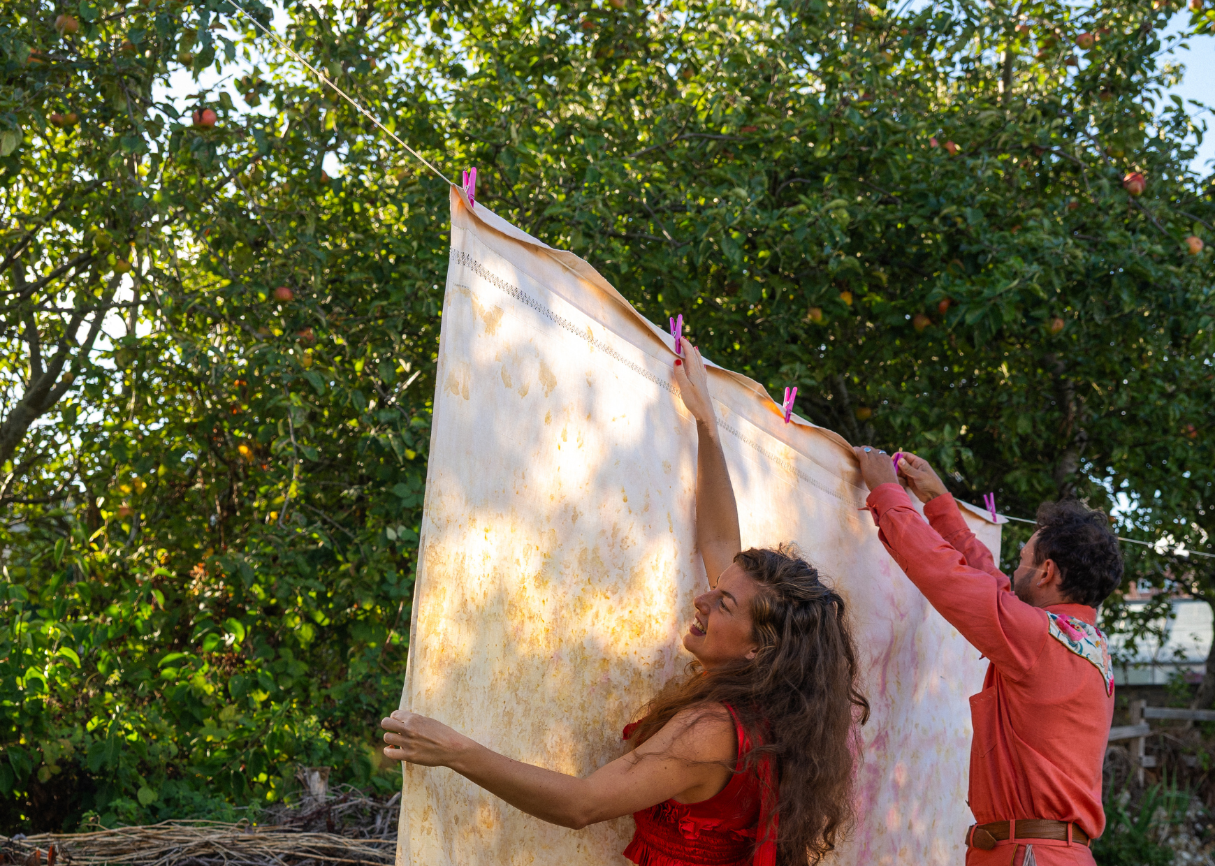The cotton emerged freckled with ochre, yellow, and blush pink, the quiet fingerprints of old neighbours marigold and rose. The magic of that day felt held there, in the spontaneity of the stains, in the way joy refuses to be tidy. We dried the sheets on the line beneath the blazing summer sun, and then, inevitably, life hurried on. The fabric was folded away. Time slipped past.