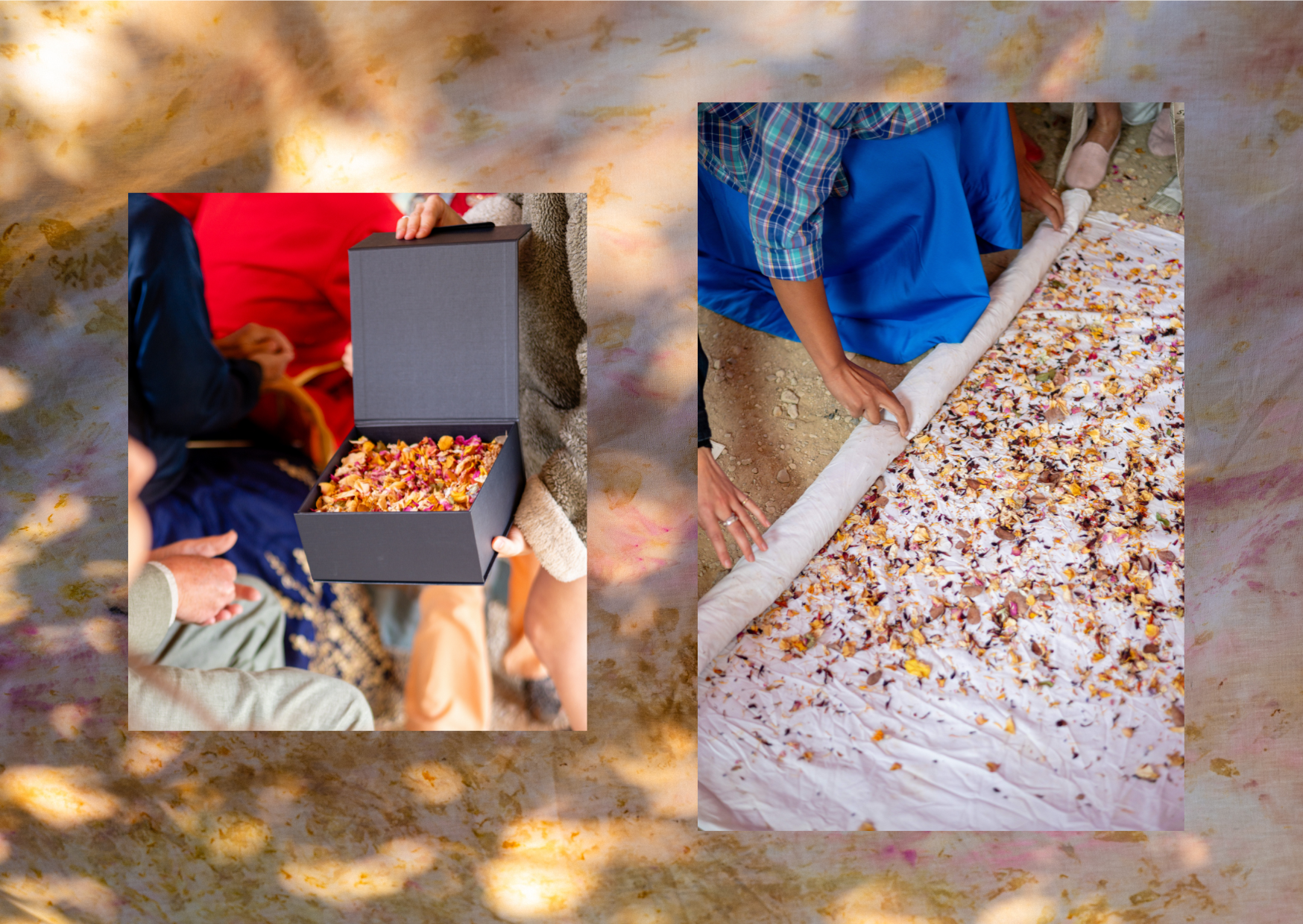 Before the wind could steal them away, those same friends gently rolled up the petal-strewn fabric, preserving that moment of matrimony. A week later, I boiled the sheets in a big pan, full of steam and witchy wishes, letting memory and colour seep into the cloth.