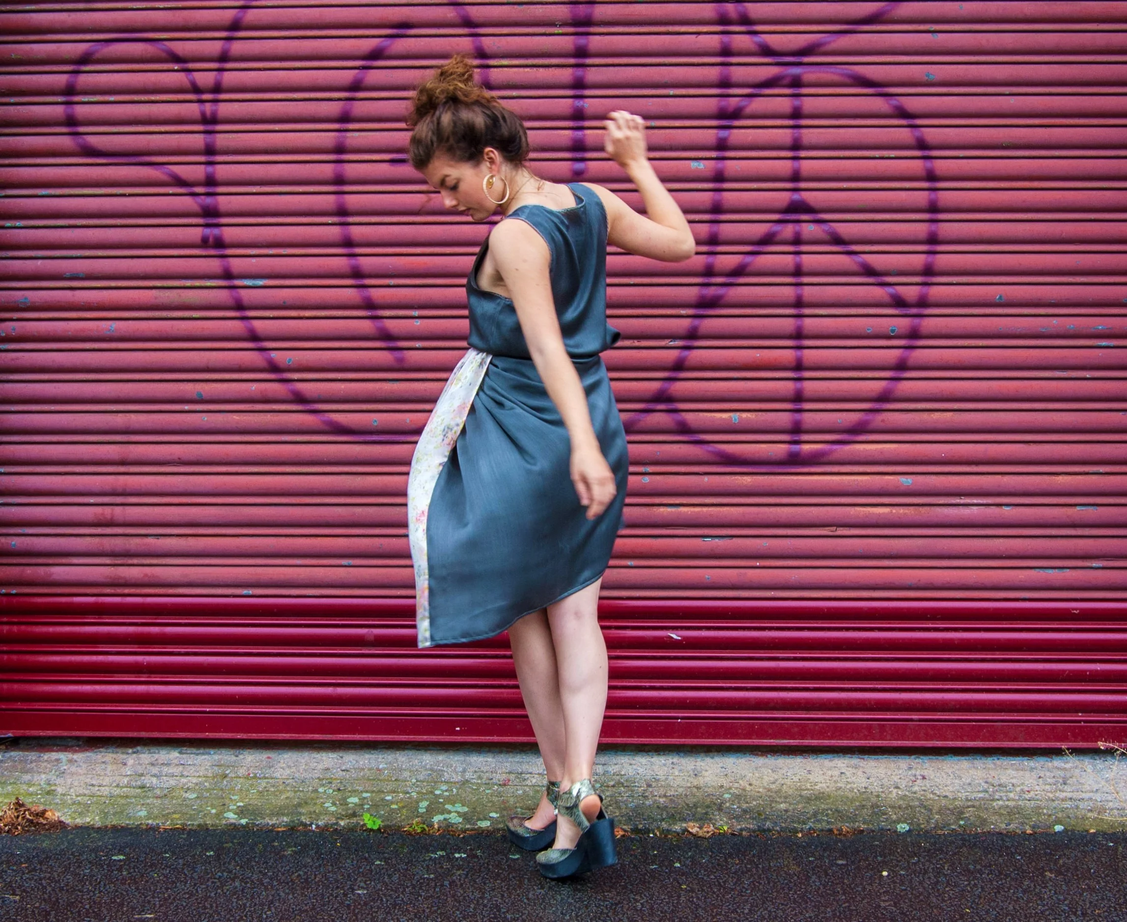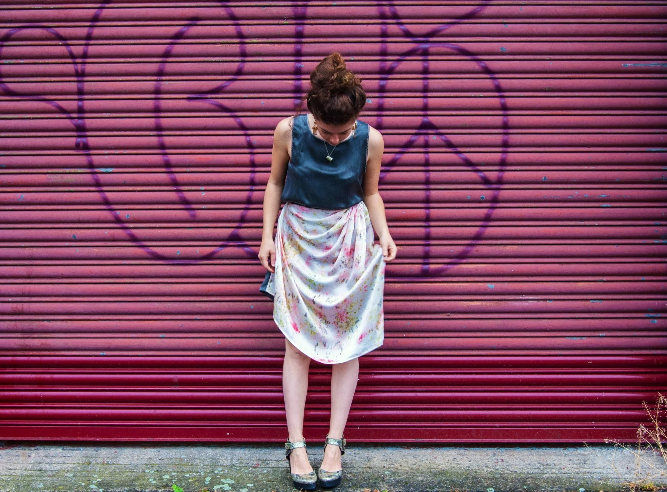 Botanical Inks is an Bristol based natural dye company. They run beautiful workshops teaching people to forage for local colour- producing plants and use a variety of non-toxic dye and print processes to colour locally grown and woven wool and organic peace silk. Babs Behan who is the brains behind the operation has been running evening workshops in our studio which look like such fun! So, having seen the beautiful fabrics she can make, I asked her if she had any scraps I could buy. She produced this beautiful piece of silk, dyed using cornflowers, rose petals and madder. I decided to drape it with some plain grey silk to create this gathered skirt. Possibly my favourite garment to date, thanks Botanical Inks!