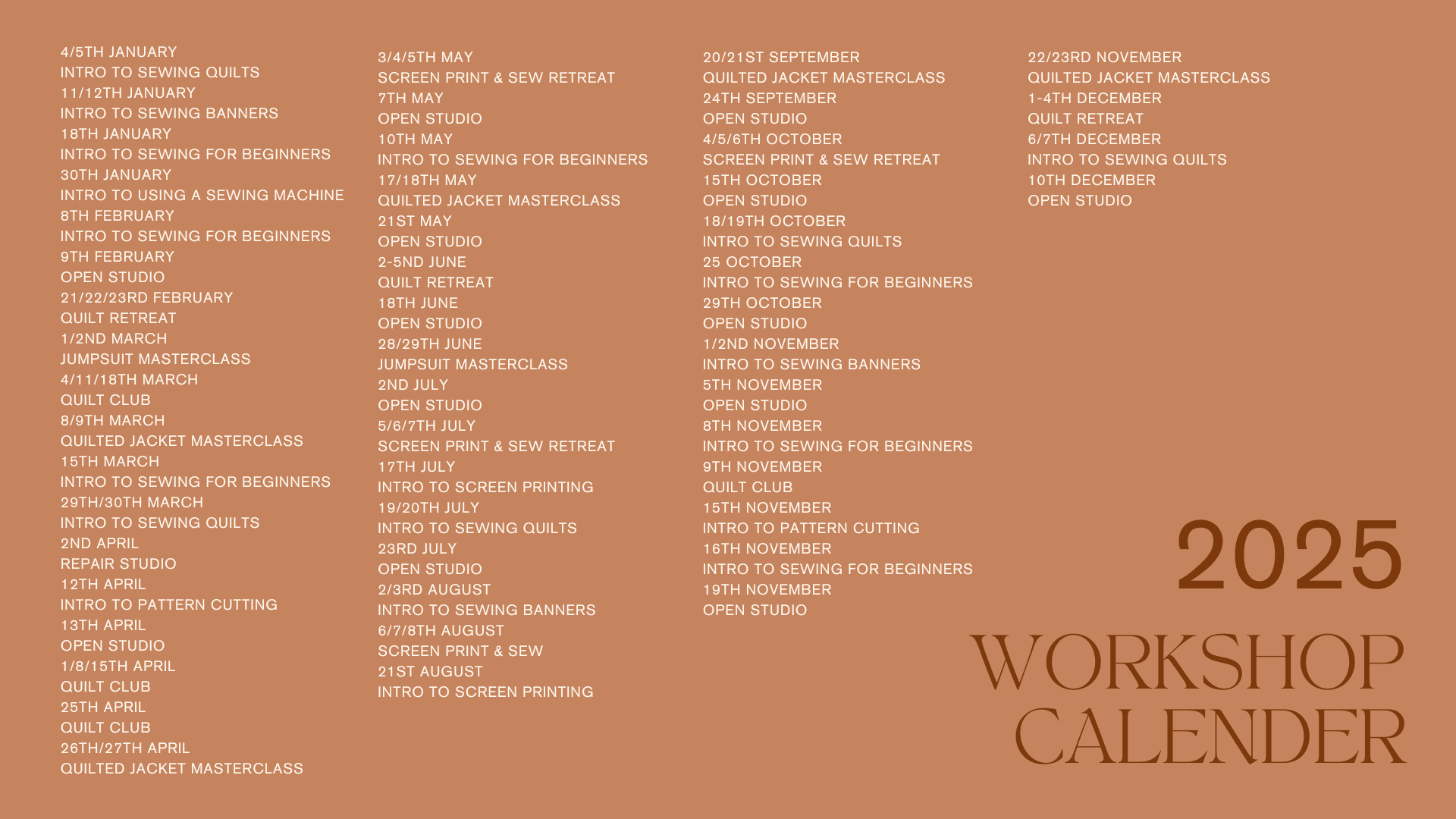 Let’s start with the good stuff. We sold out and had the joy of running over 50 sewing workshops this year. Thank you so much to each and every one of you who joined us. As you can see below, our 2025 calendar was busy but our brilliant team of teachers were up for the challenge. I’ve always felt like our workshops are a co-creation between the preparation and care we put into designing them and then the energy our students bring to the room. Sprinkled on top of that is a magic ingredient which you can’t guarantee (but comes when the time is right) and that is the friendships and connections that naturally form between those in the room. I feel so lucky to have met so many wonderful people through teaching. It’s also been lovely to see our newer team members grow in confidence and transition from assisting workshops to running them. That transition has only been made easier because of how lovely our students are.